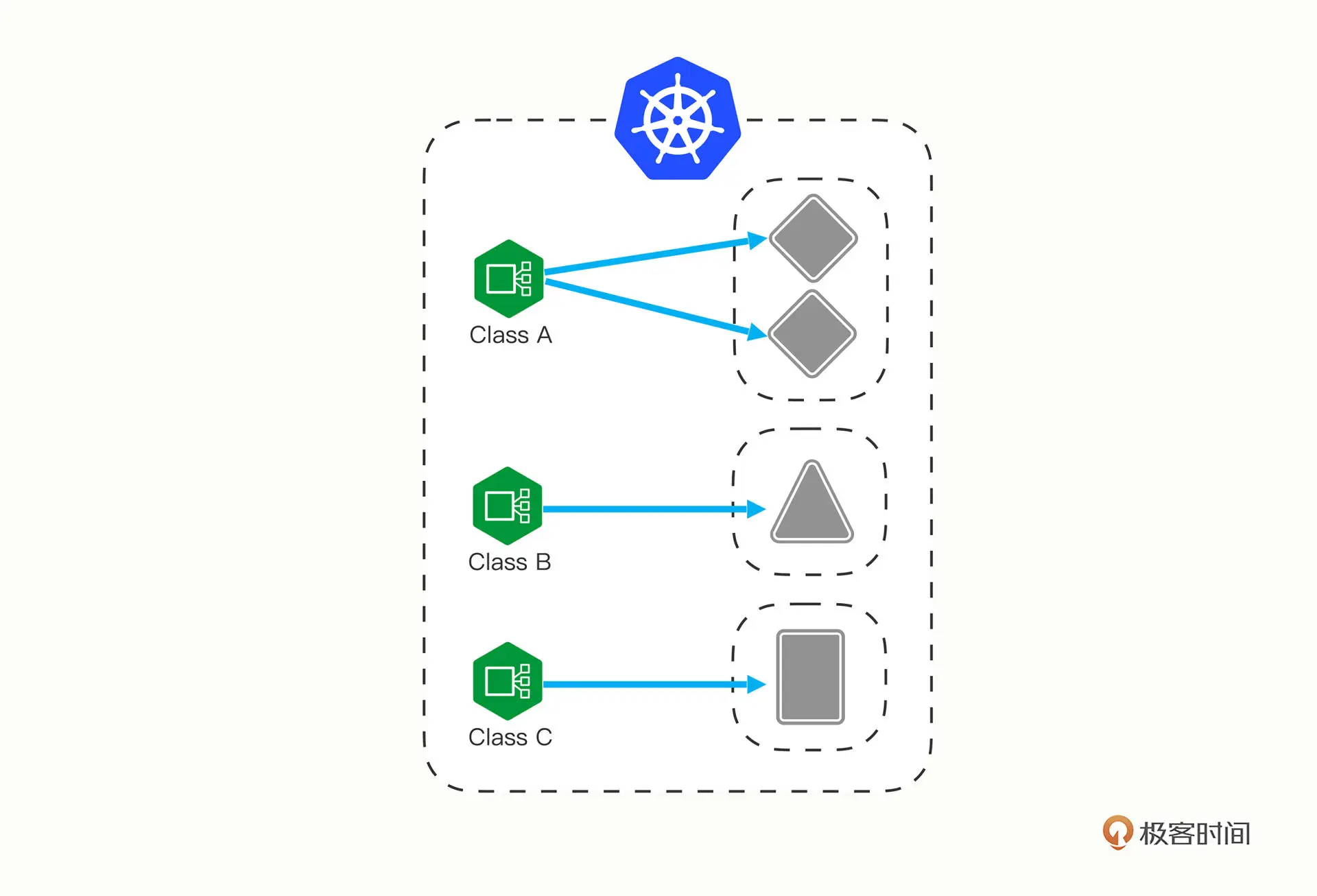 K8s 用户可以转向管理 Ingress Class,用它来定义不同的业务逻辑分组,简化 Ingress 规则的复杂度。比如说,我们可以用 Ingress Class A 处理博客流量、Ingress Class B 处理短视频流量、Ingress Class C 处理购物流量。